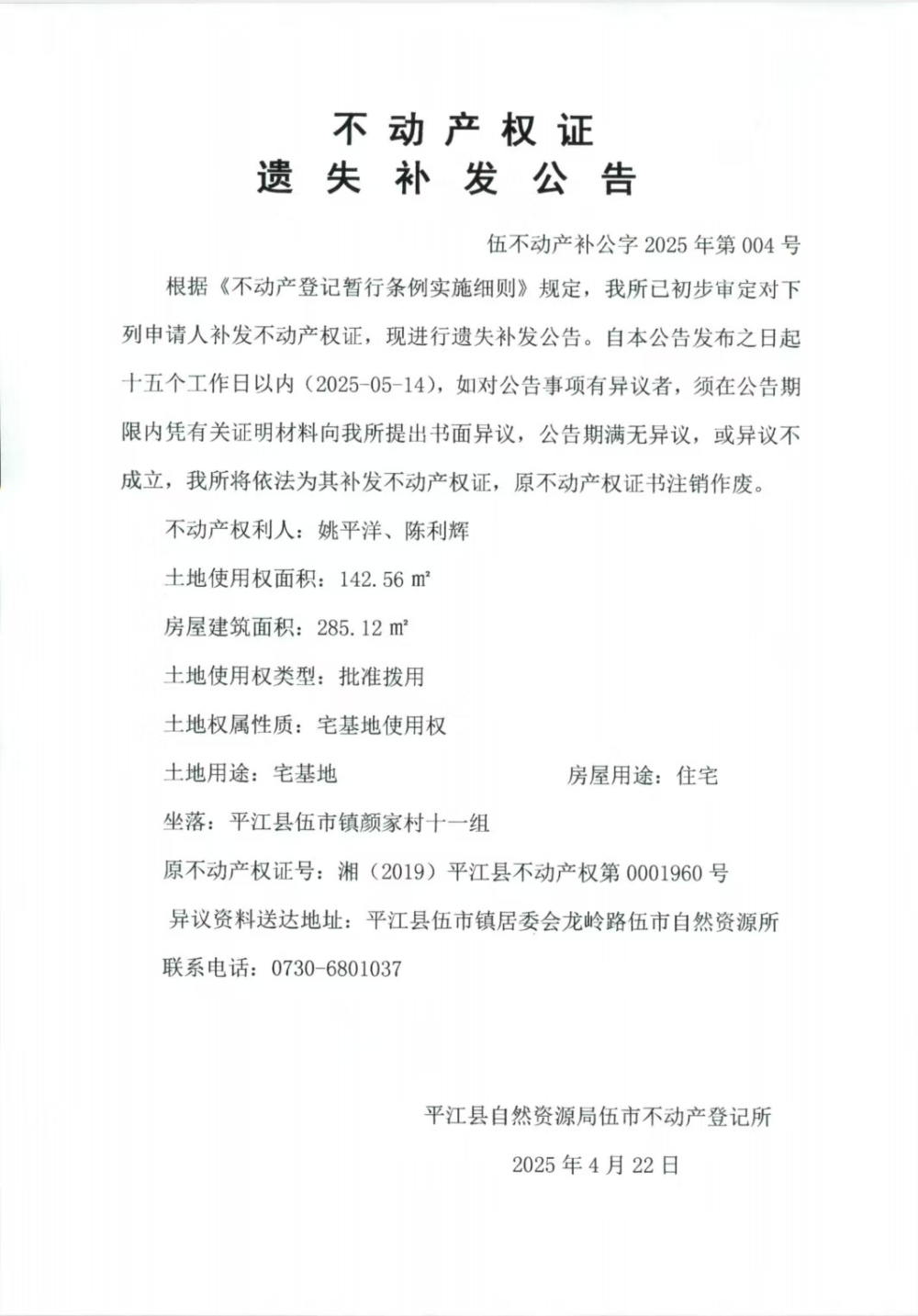 姚平洋 陈利辉 不动产权证遗失补发公告