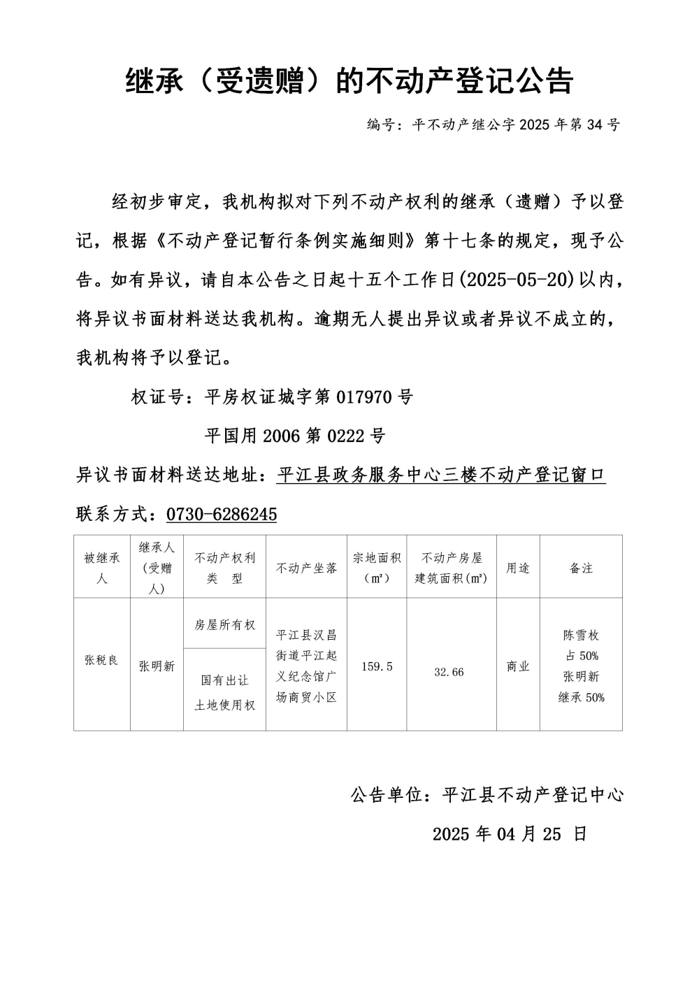 张明新 继承不动产登记公告202534