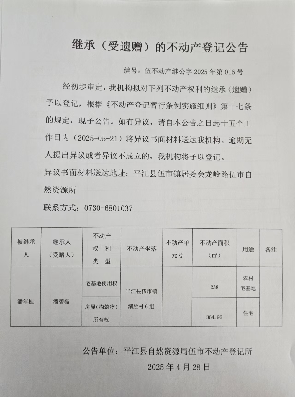 潘碧磊 继承的不动产登记公告