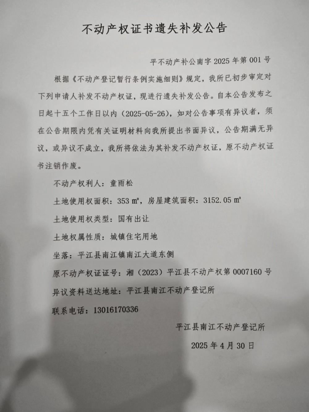 童雨松不动产权证遗失补发公告