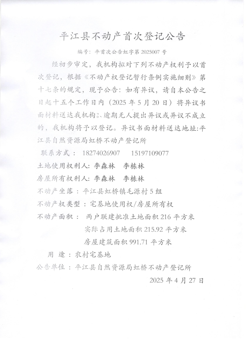 李森林 李栋林不动产首次登记公告