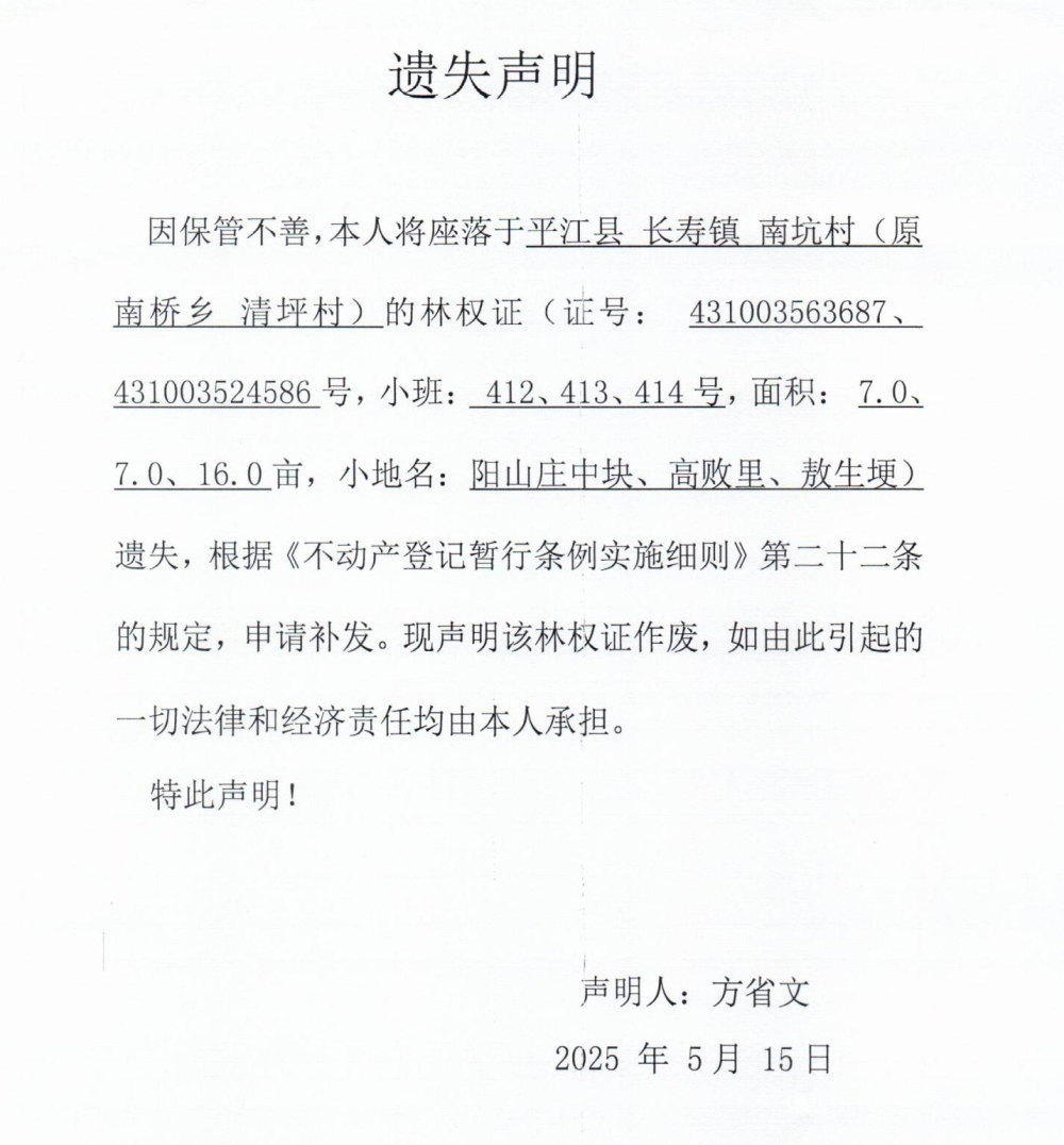 方省文林权证遗失声明