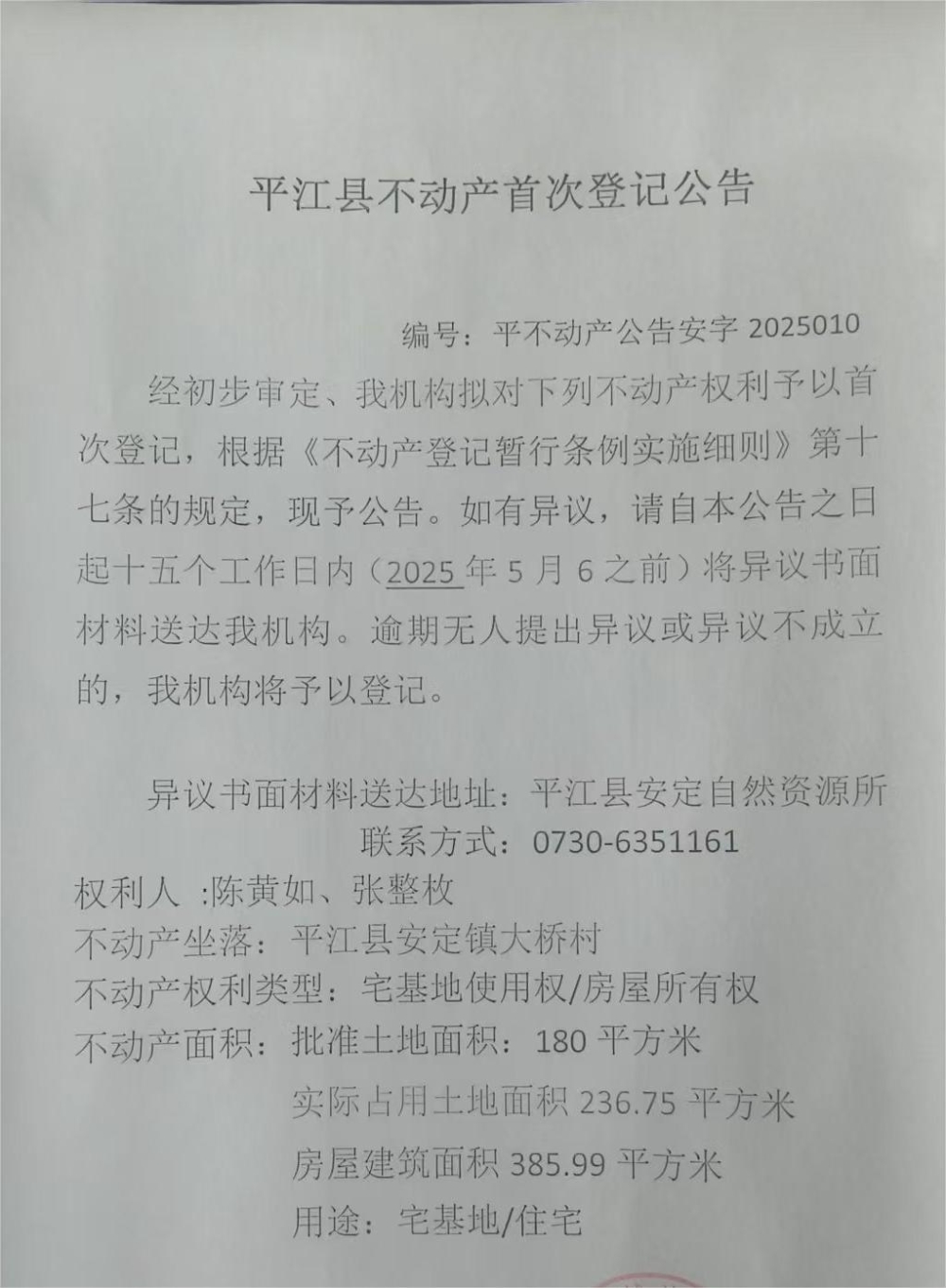 安定镇大桥村陈黄如、张整枚宅基地首次登记公告