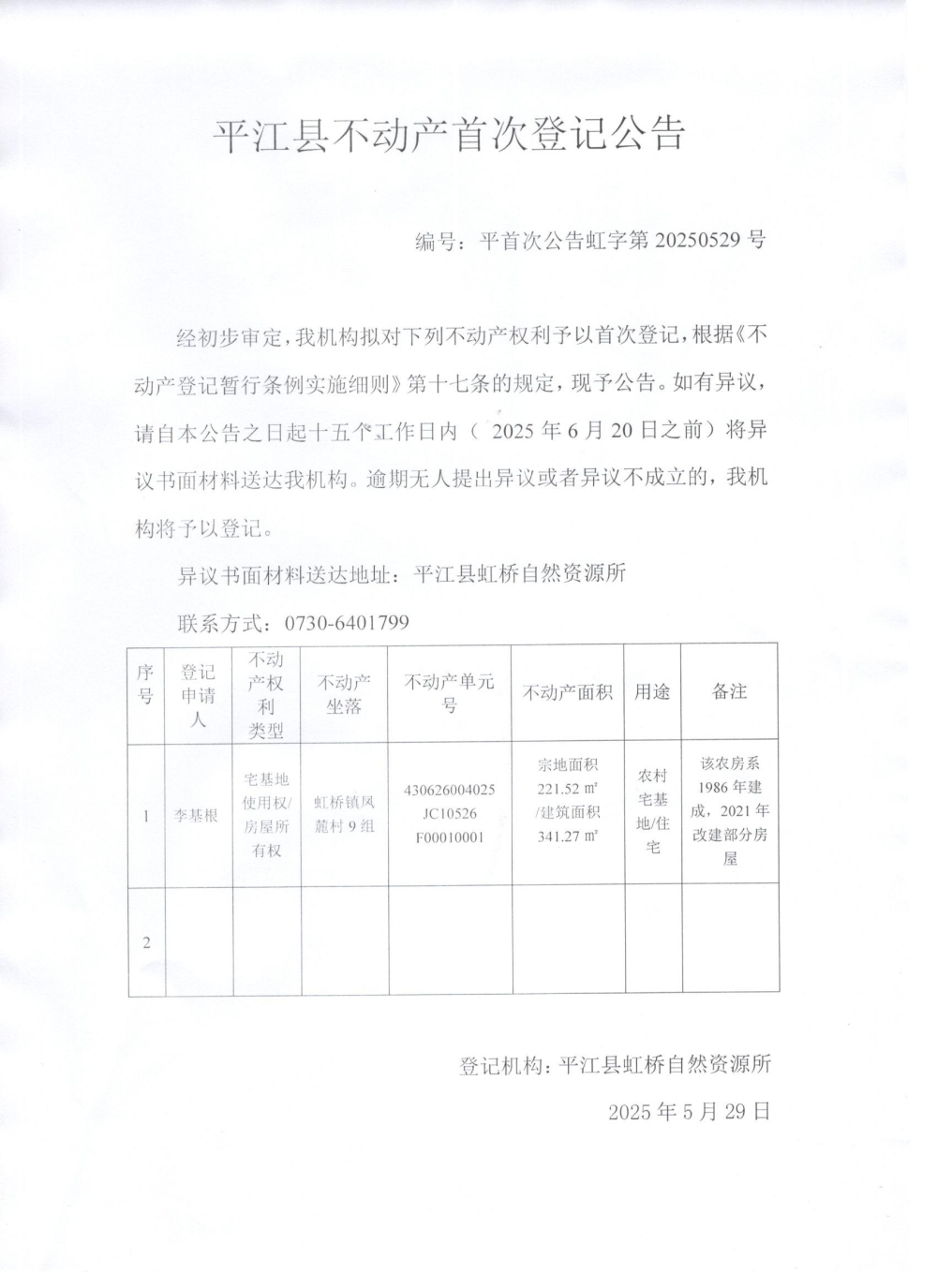 虹桥镇李基根不动产权首次登记