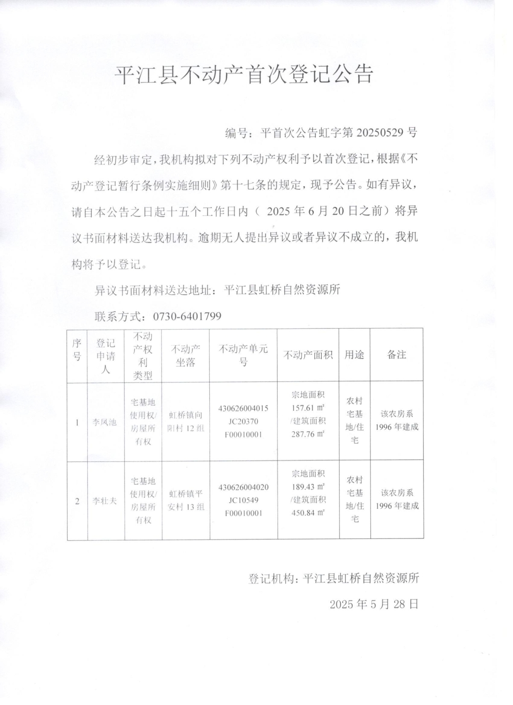 虹桥镇李凤池、李壮夫不动产首次登记公告