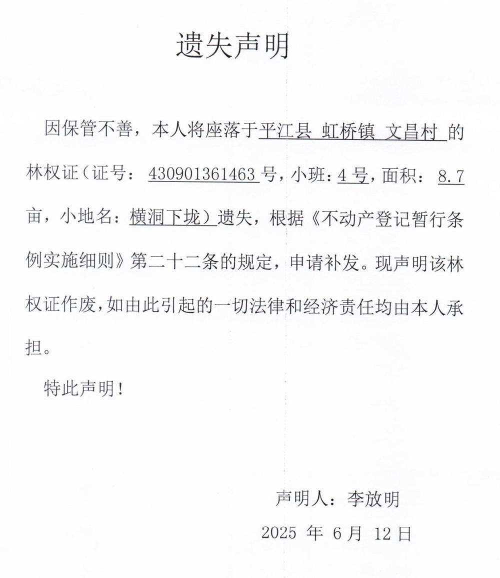 李放明林权证遗失声明