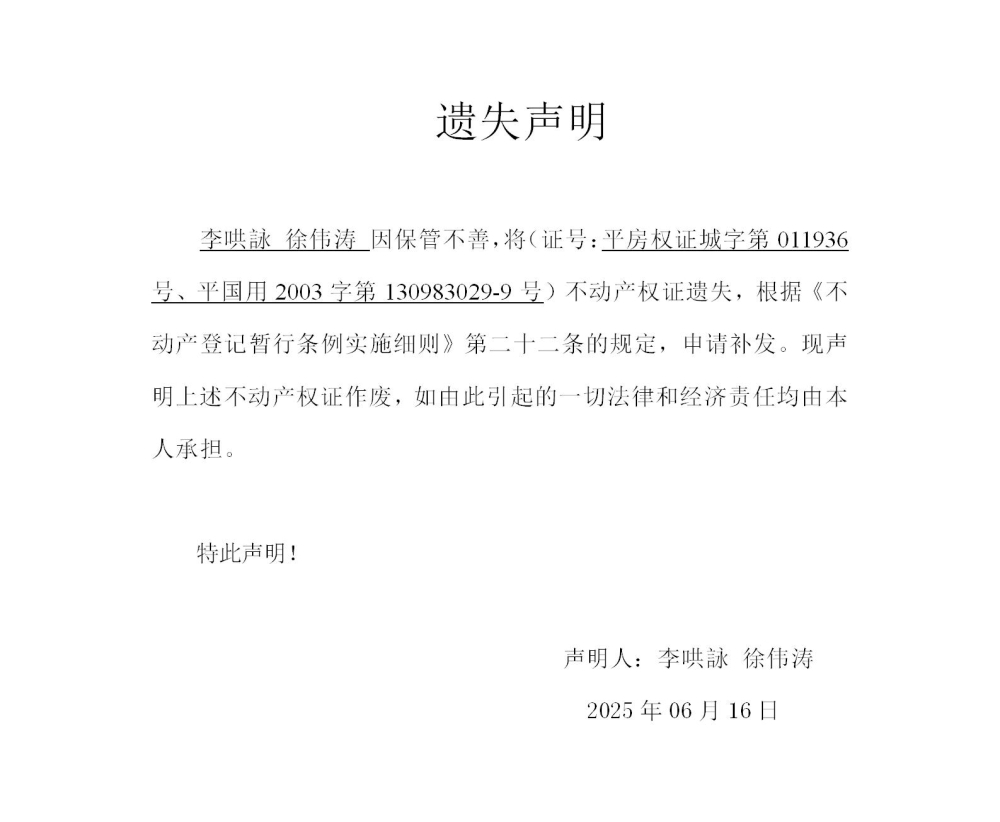 李哄詠 徐伟涛 不动产权证遗失声明202541