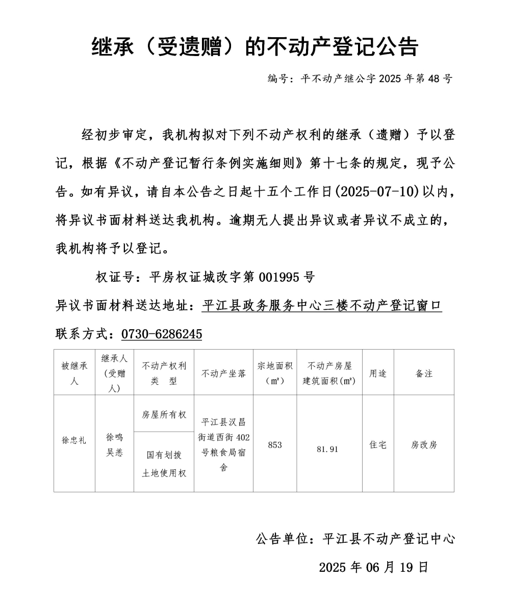 徐鸣 吴恙 继承不动产登记公告202548