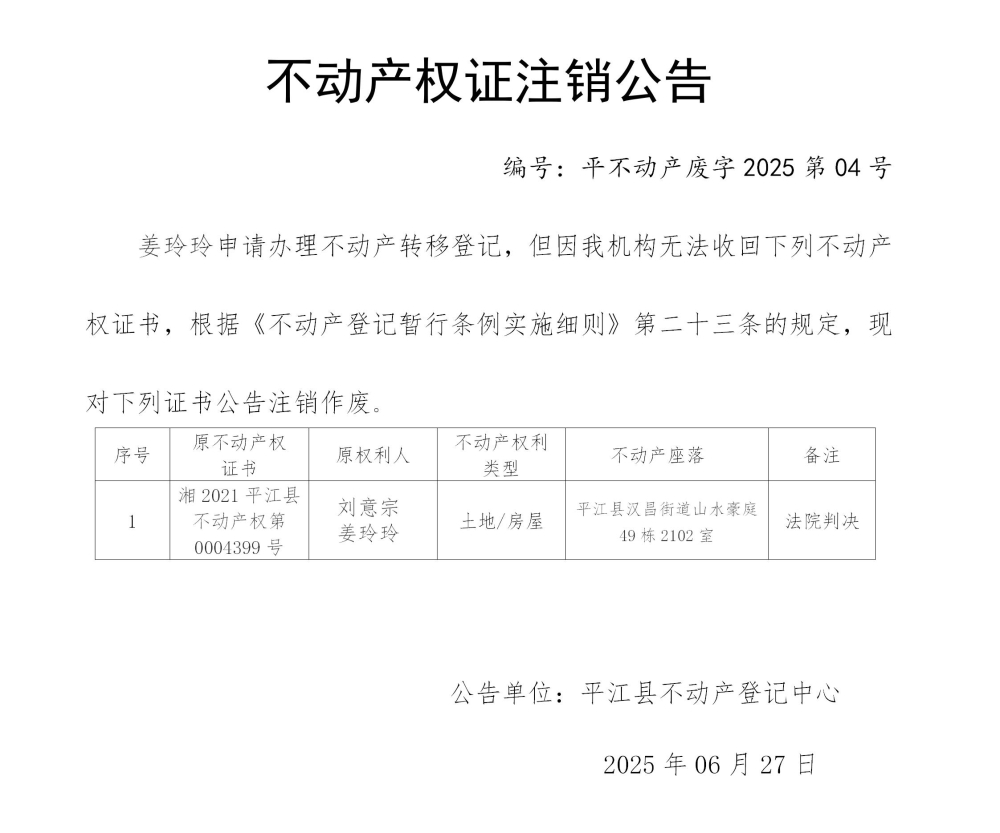 刘意宗 姜玲玲 不动产权证注销作废公告202504