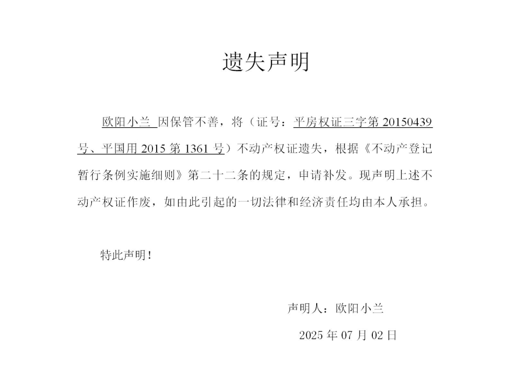 欧阳小兰 不动产权证遗失声明202544
