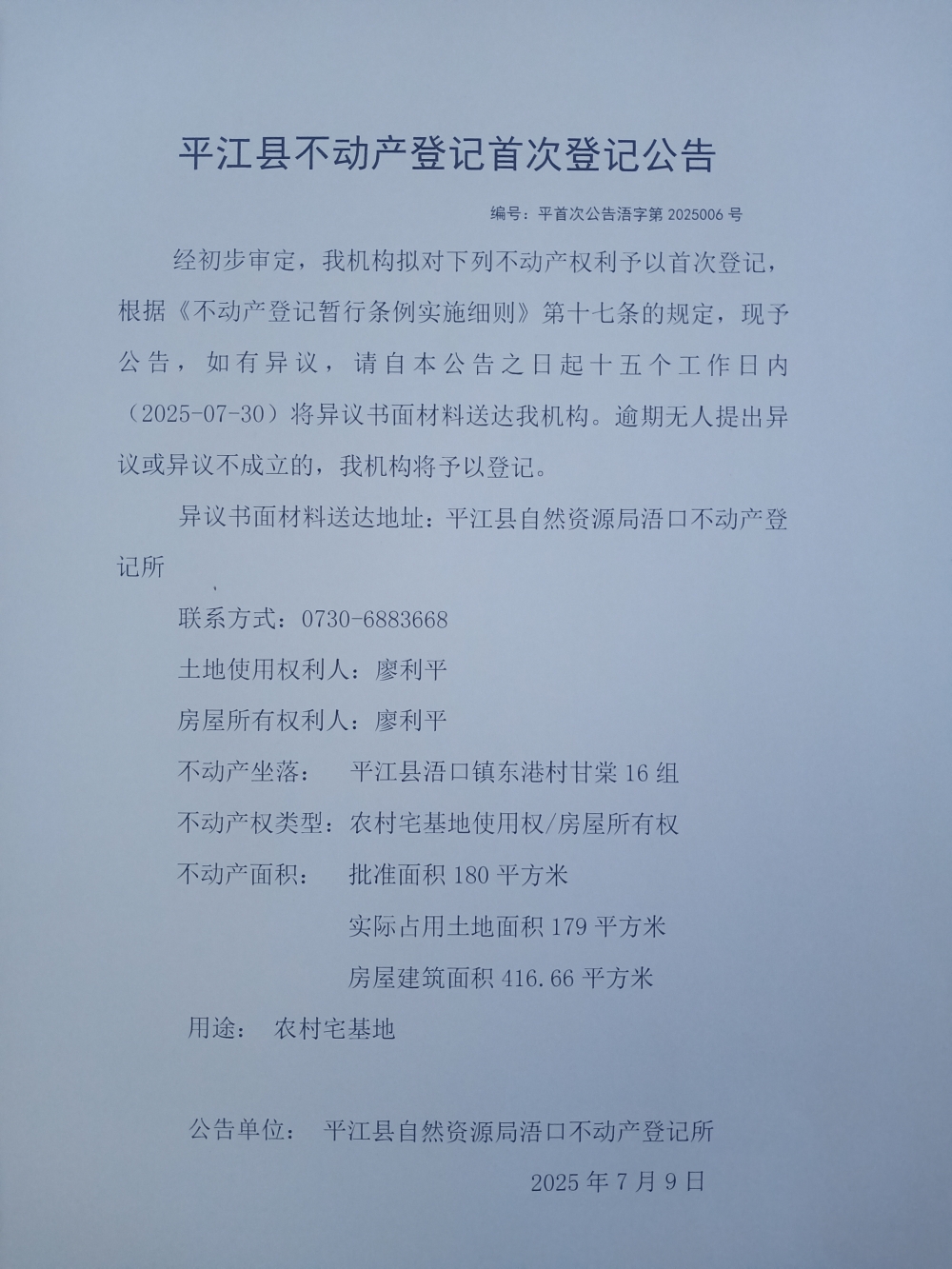 廖利平 不动产登记首次登记公告