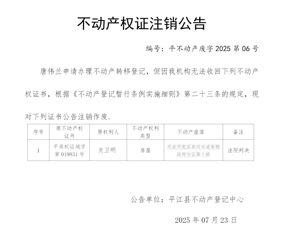 皮卫明 不动产权证注销作废公告202506
