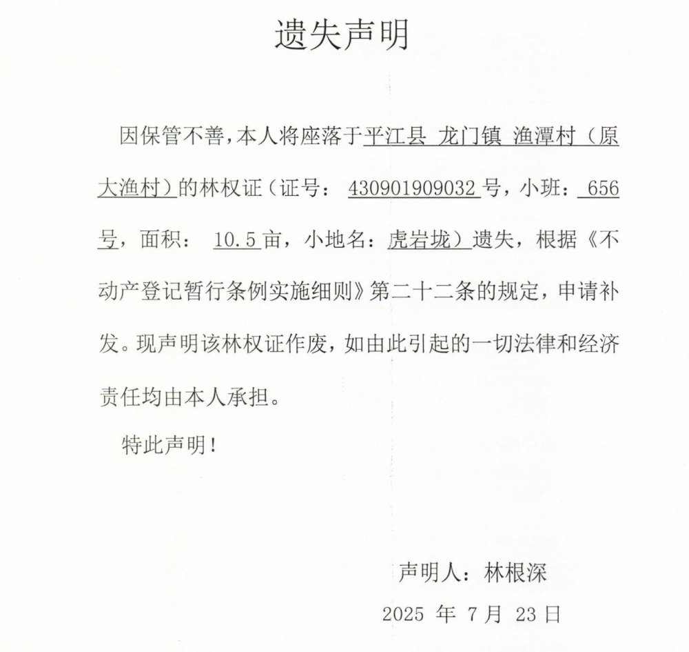 林根深林权证遗失声明