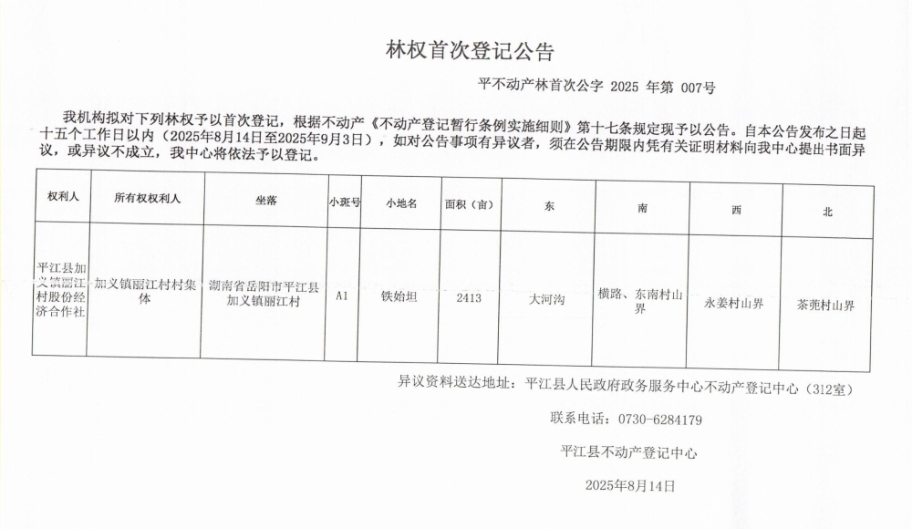 平江县加义镇丽江村股份经济合作社林权首次登记公告
