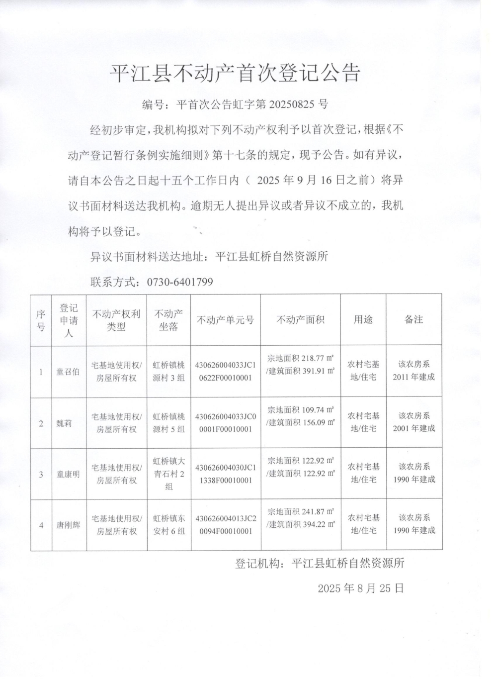 虹桥镇童召伯、魏莉、童康明、唐刚辉不动产首次登记公告
