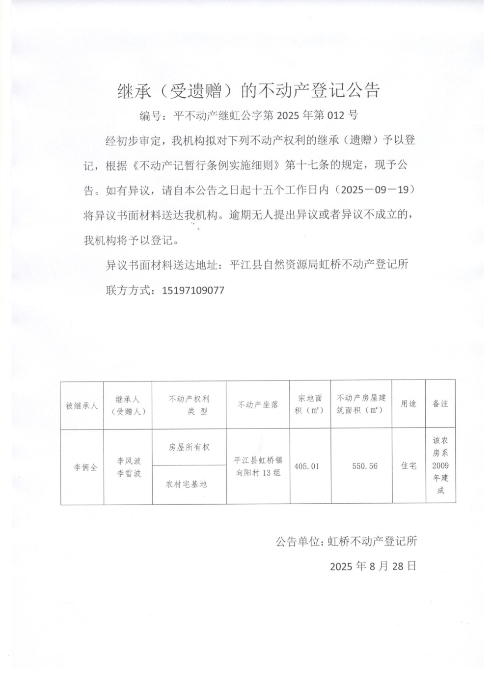 虹桥镇李风波、李雪波不动产受继承登记公告