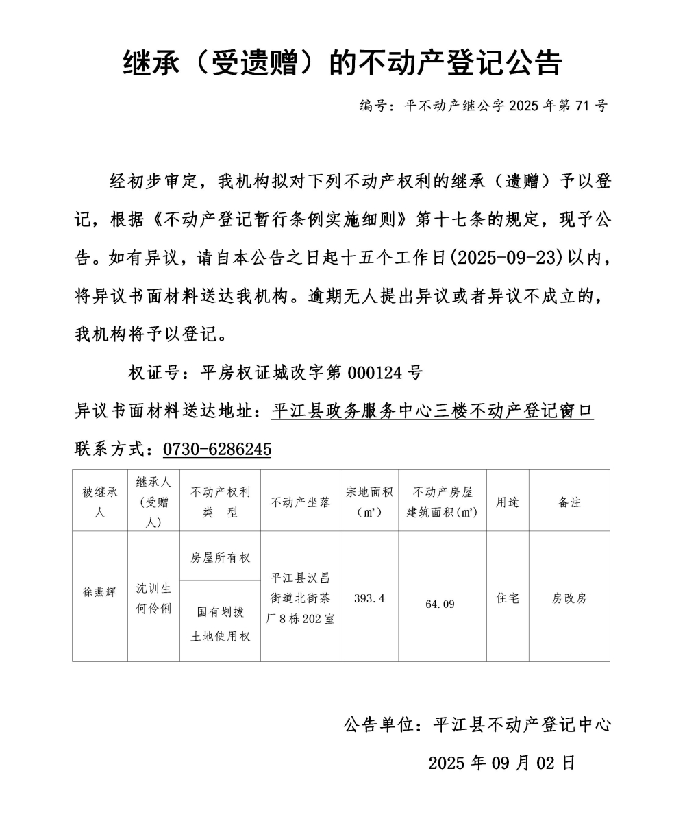 沈训生 何伶俐 继承不动产登记公告202571