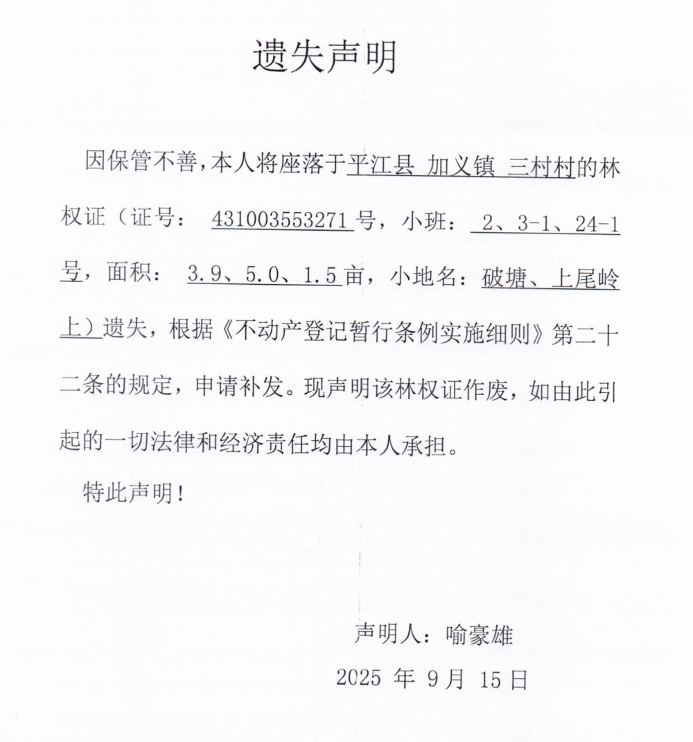 喻豪雄林权证遗失声明
