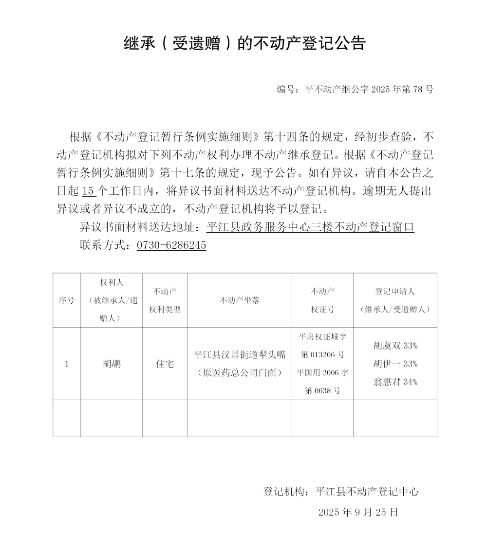 胡虞双 胡伊一 翁惠君 继承不动产登记公告202578