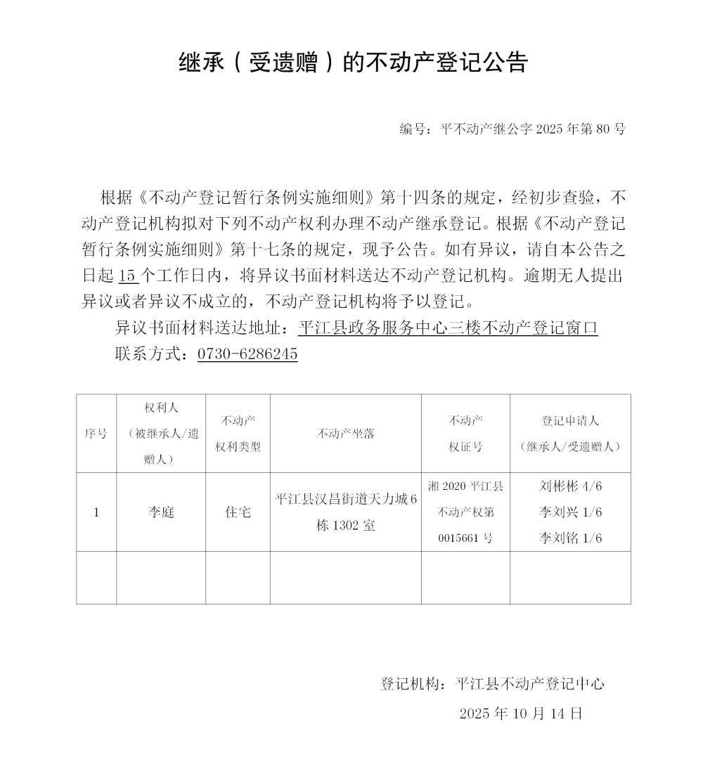 刘彬彬 李刘兴 李刘铭 继承不动产登记公告202580