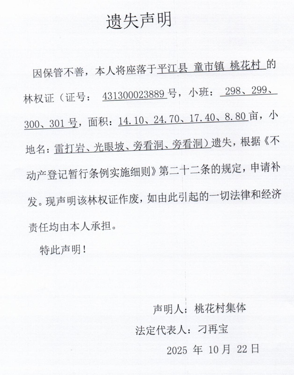 桃花村集体林权证遗失声明