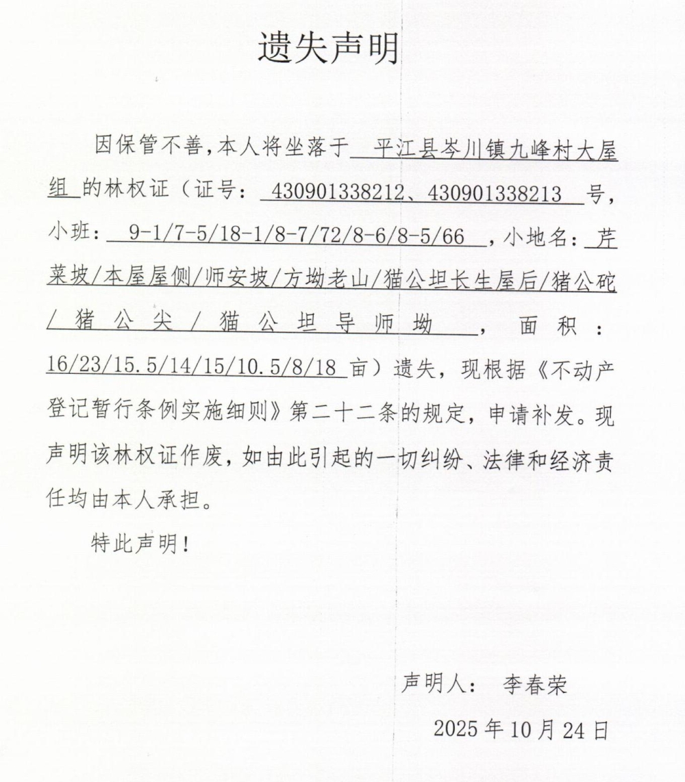 李春荣林权证遗失声明