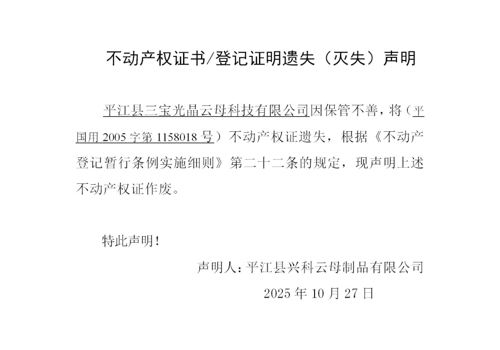 平江县兴科云母制品有限公司 不动产权证遗失声明202578