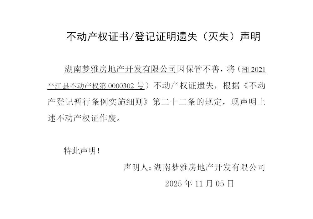 湖南梦雅房地产开发有限公司 不动产权证遗失声明202582