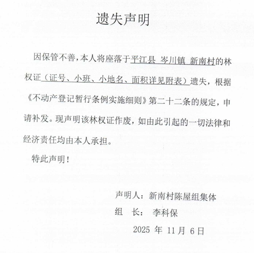 新南村陈屋组集体林权证遗失声明