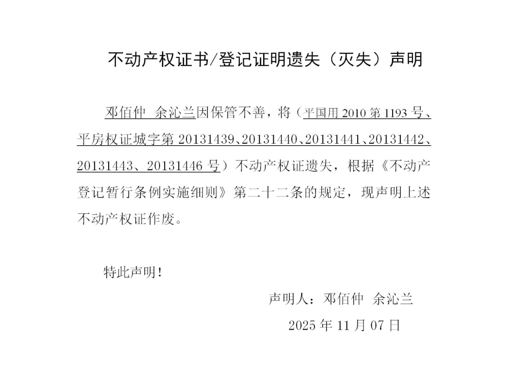 邓佰仲 余沁兰 不动产权证遗失声明202583