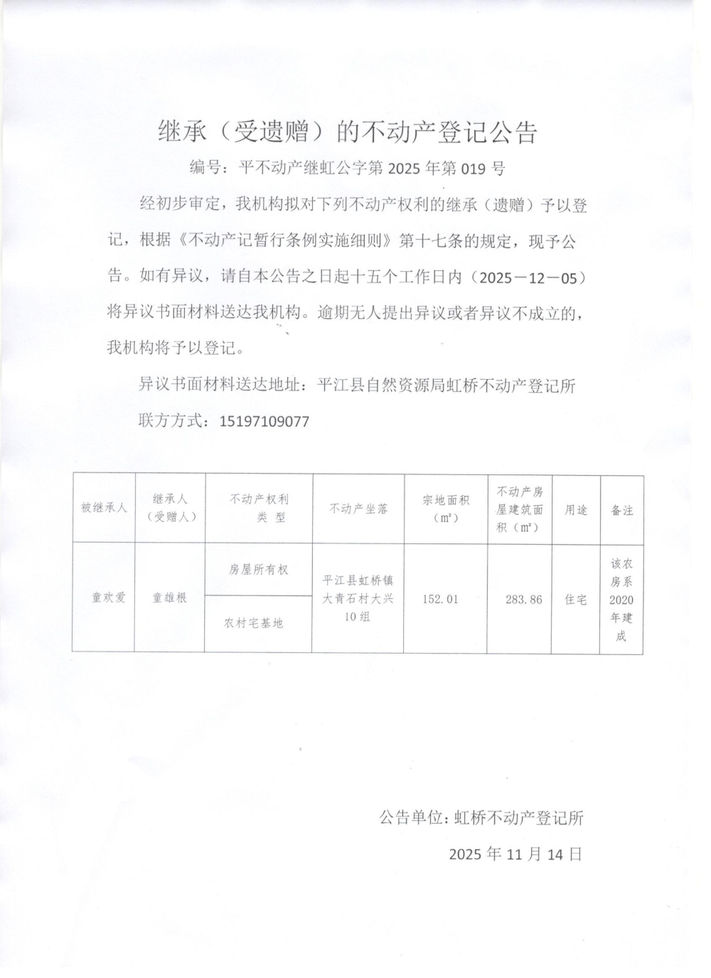 虹桥镇大青石村童雄根不动产受继承登记公告