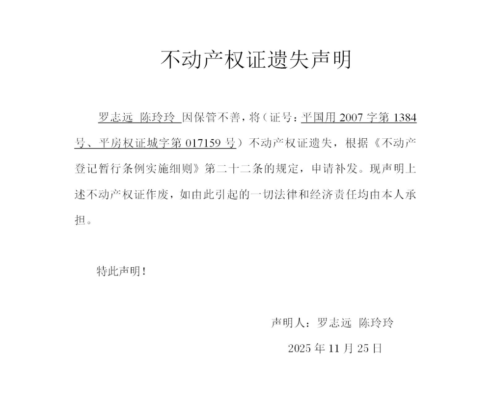 罗志远 陈玲玲 不动产权证遗失声明202588