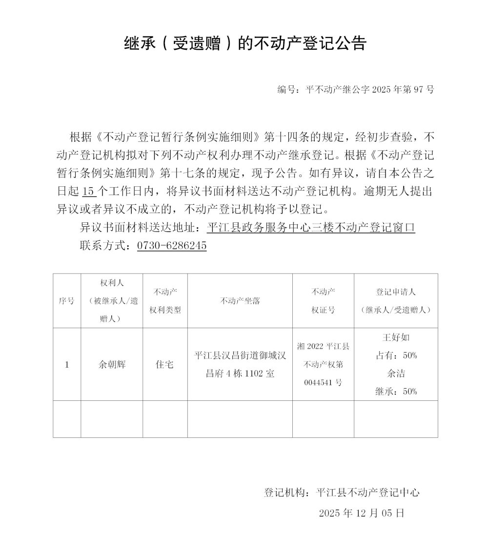 余洁 继承不动产登记公告202597
