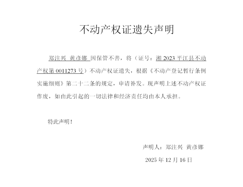 郑注兴 黄彥娜 不动产权证遗失声明202594