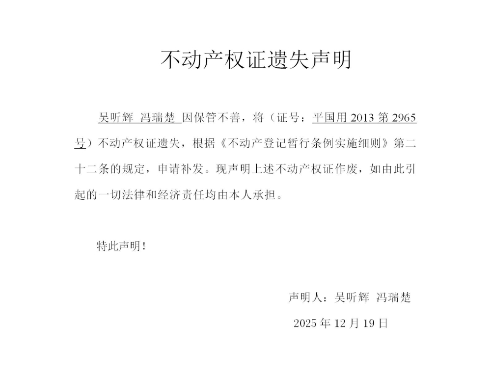 吴听辉 冯瑞楚 不动产权证遗失声明202597