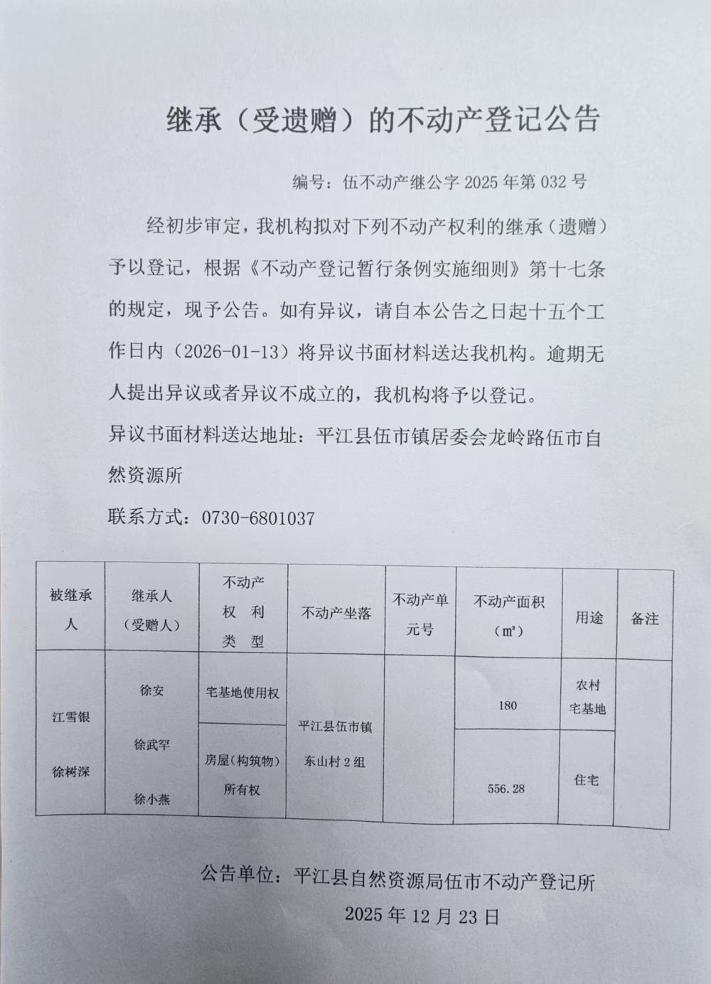 徐安 徐武罕 徐小燕 继承的不动产登记公告