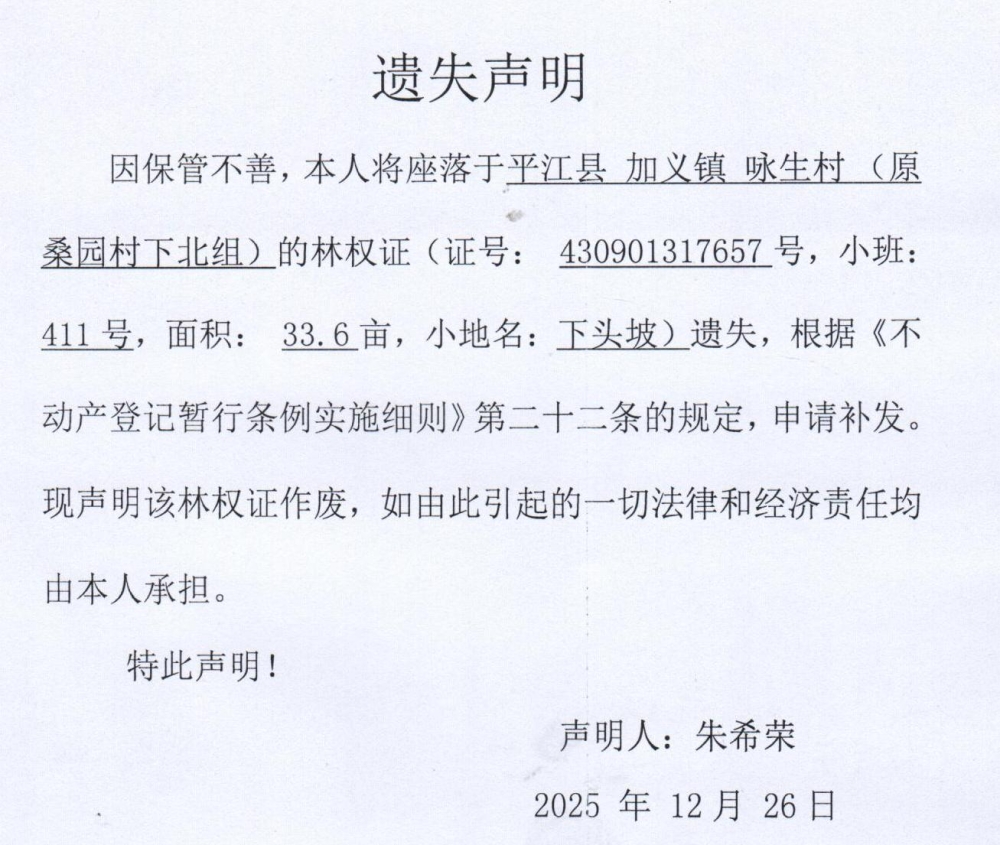 朱希荣林权证遗失声明