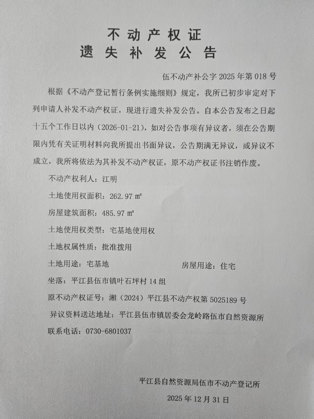江明 不动产权证遗失补发公告