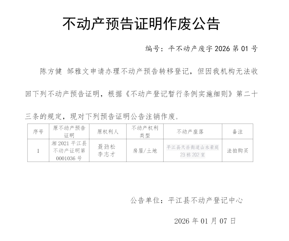 陈方健 邹雅文 不动产权证注销作废公告202601