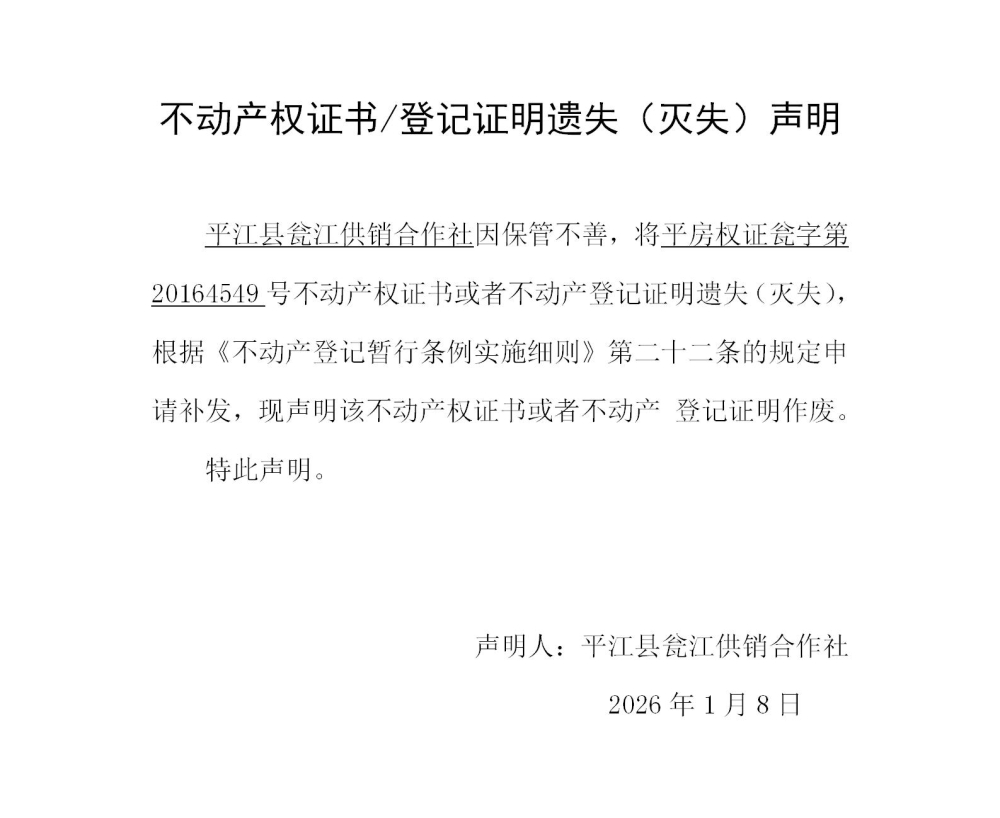 平江县瓮江供销合作社不动产权证书遗失(灭失)声明