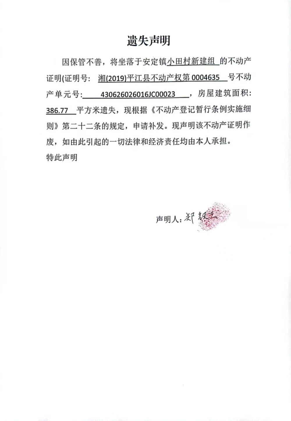 安定镇小田村郑钗玉不动产遗失声明