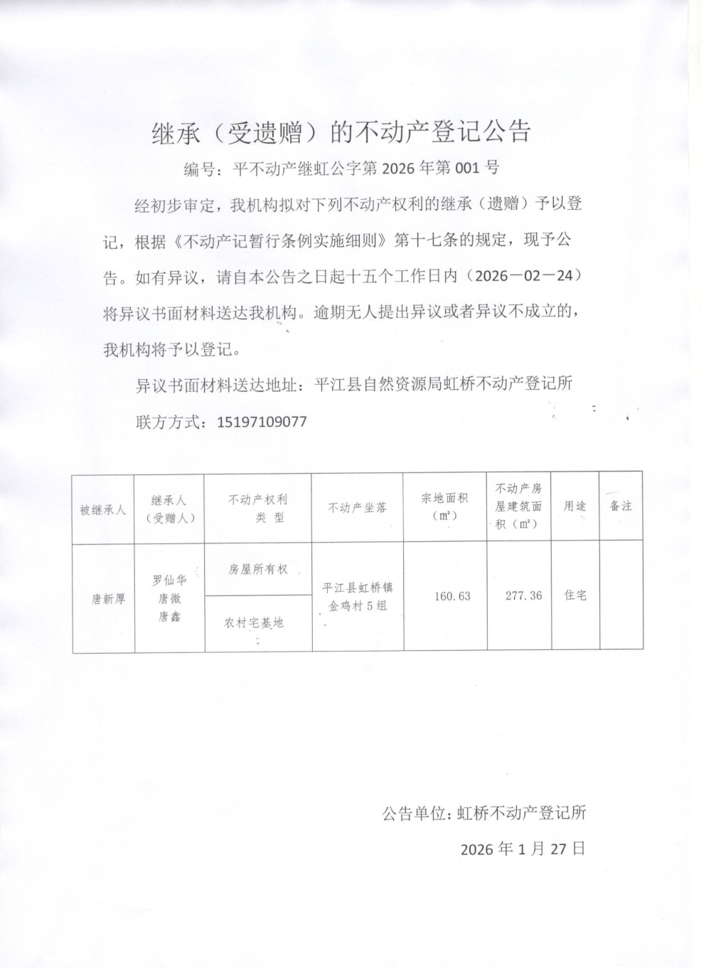虹桥镇金鸡村罗仙华,唐微,唐鑫不动产受继承首次登记公告