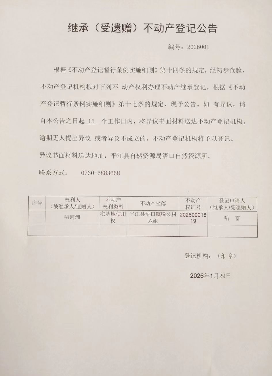 喻富 继承不动产登记公告
