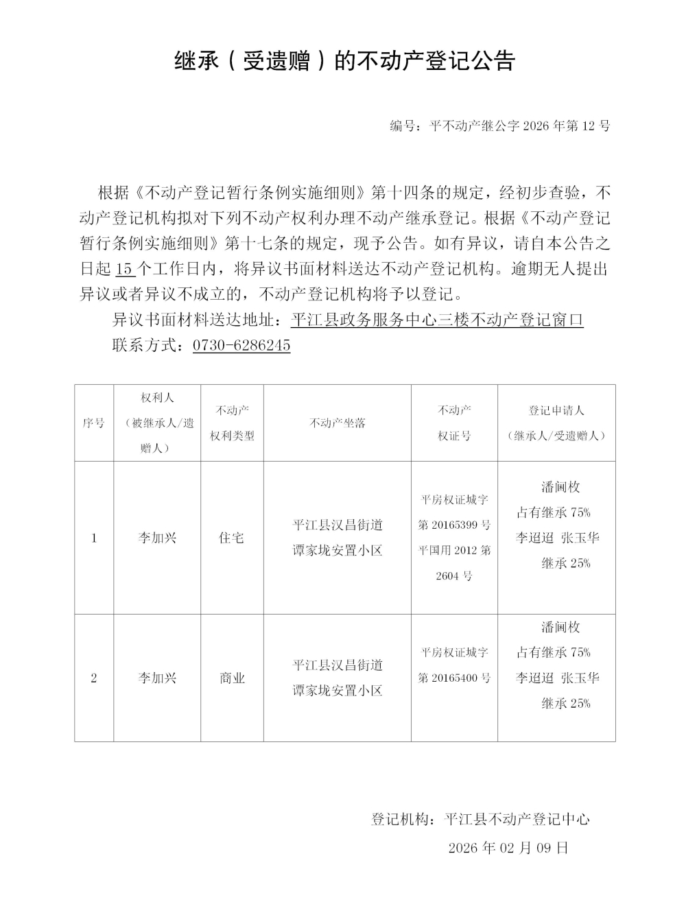 潘阃枚 李迢迢 张玉华 继承不动产登记公告202612