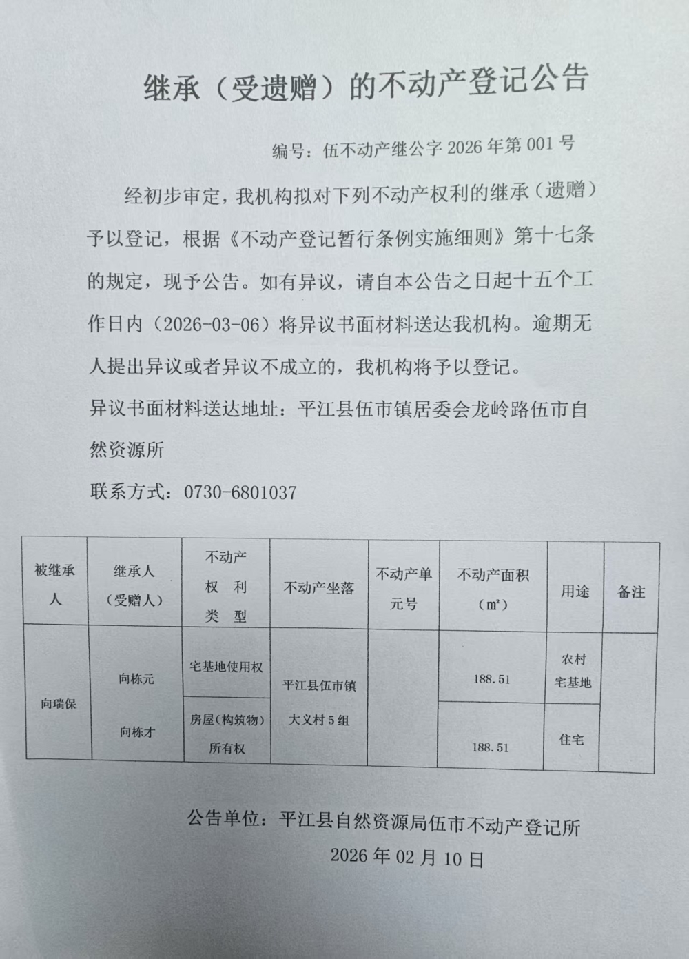 向栋元 向栋才 继承的不动产登记公告