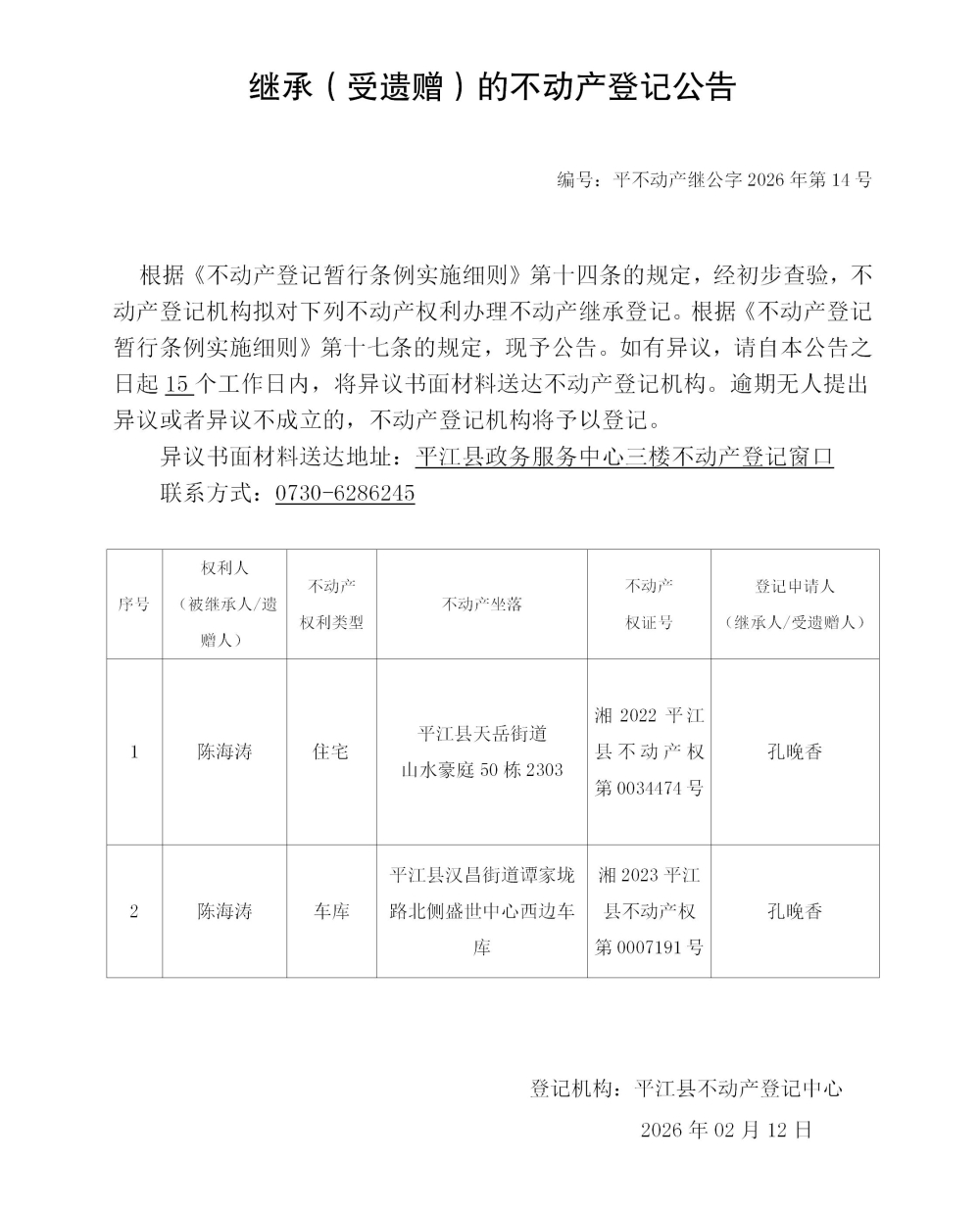 孔晚香 继承不动产登记公告202614