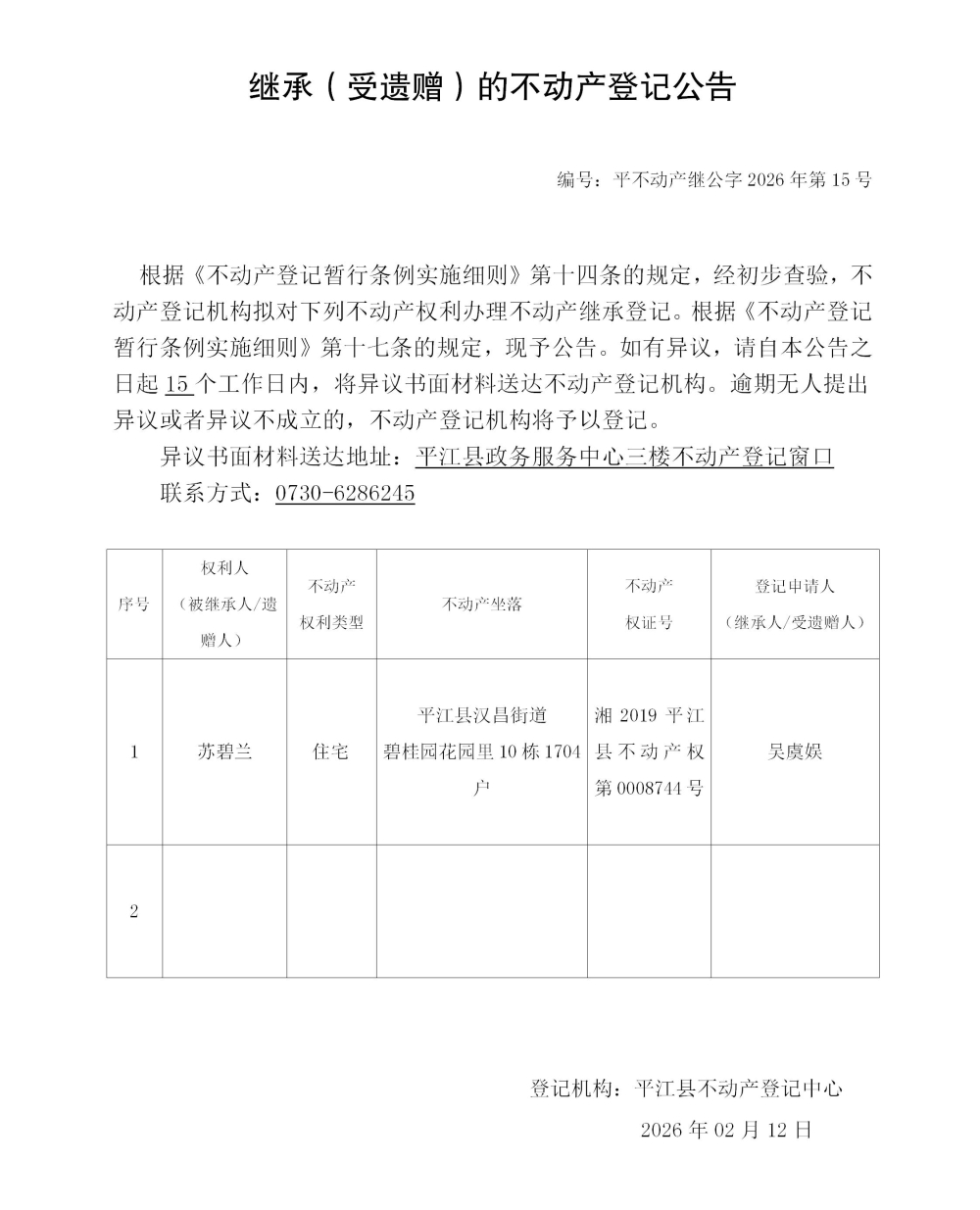 吴虞娱 继承不动产登记公告202615