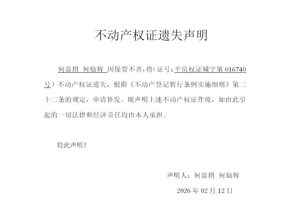 何嘉琪 何灿辉 不动产权证遗失声明202609