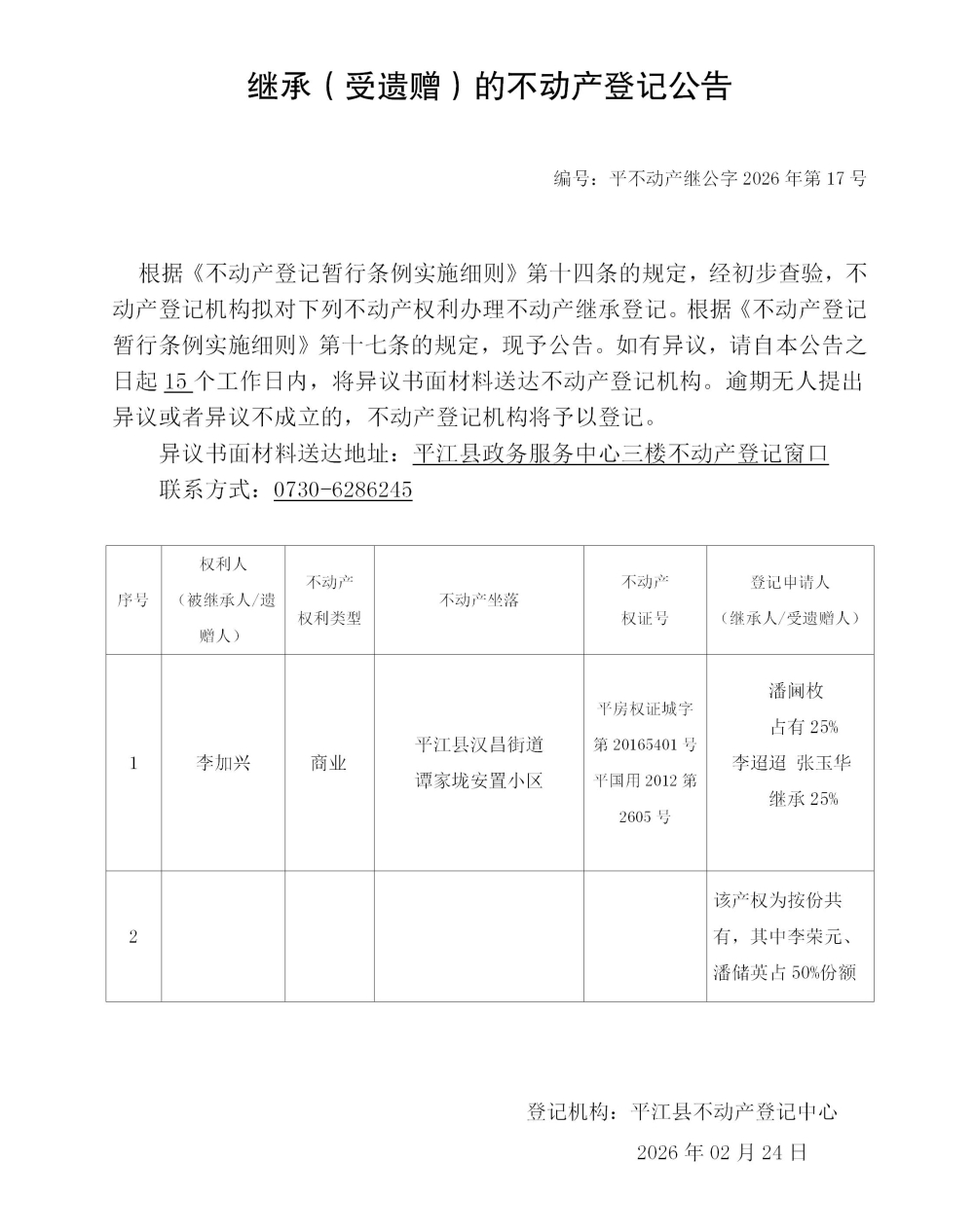 潘阃枚李迢迢张玉华继承不动产登记公告202617