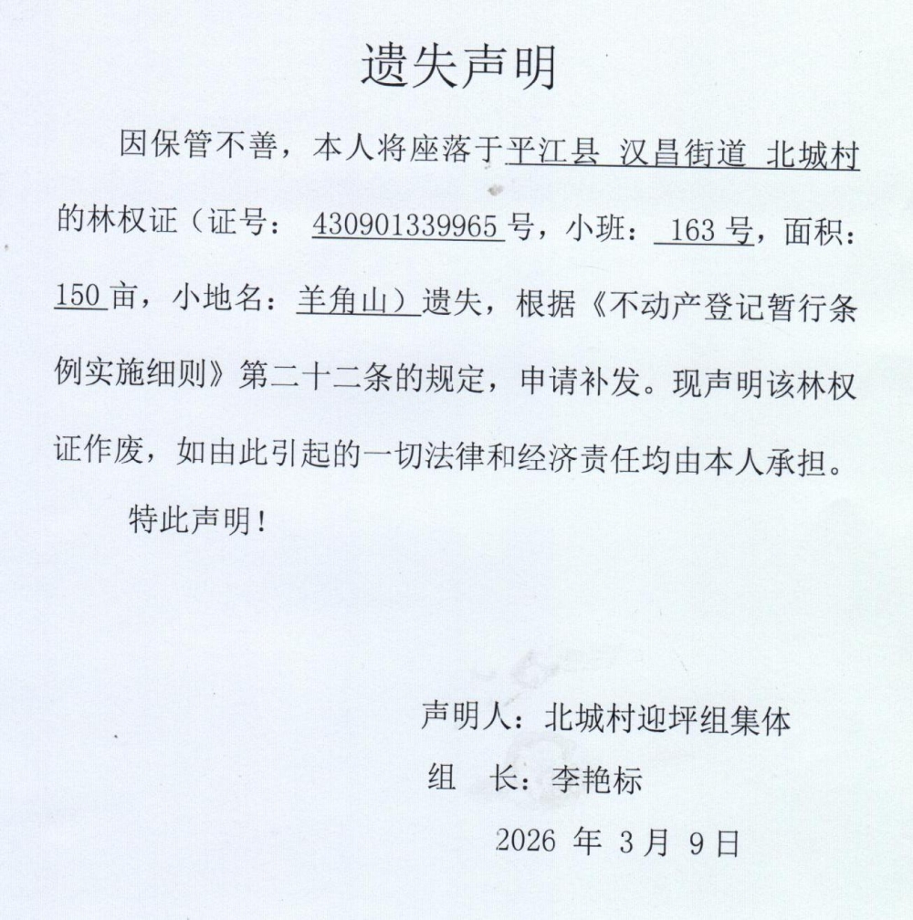 北城村迎坪组集体林权证遗失声明